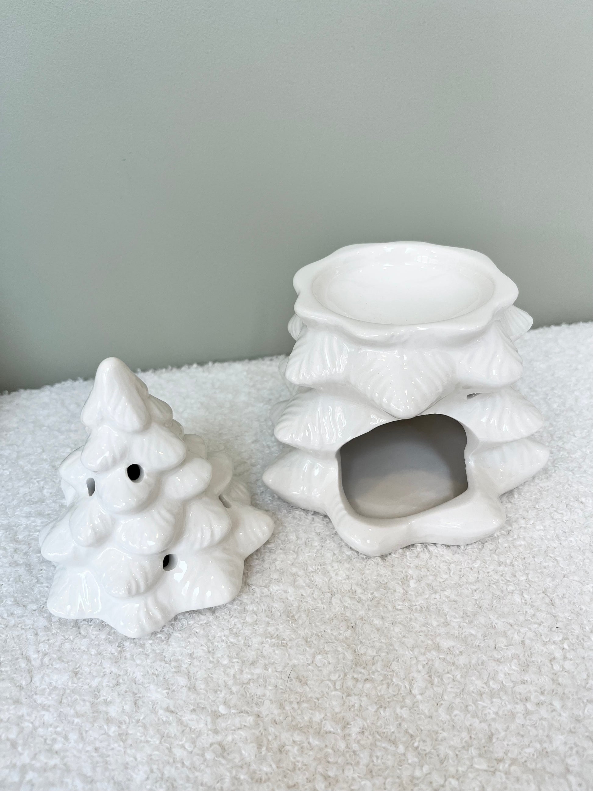 This elegant white fir tree ceramic oil burner and wax warmer brings a festive glow to any space. Perfect for use with both wax melts and fragrance oils, its a beautiful addition to seasonal dcor while filling the home with favourite winter scents. Simply place a single standard tealight in the space at the back and add a few drops of diluted fragrance oil or wax melts in the bowl. Always remove the lid whilst in use.